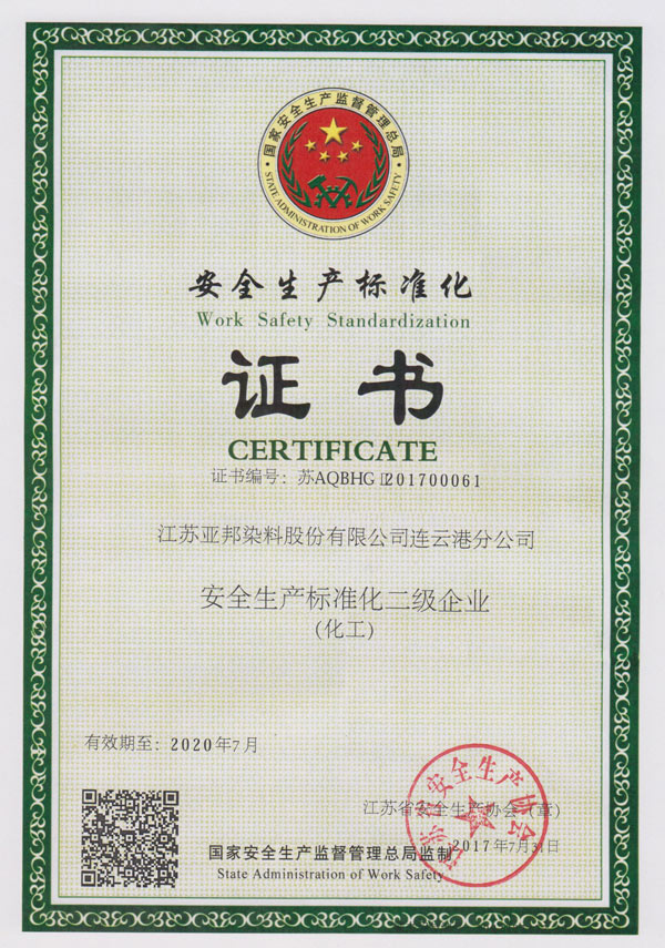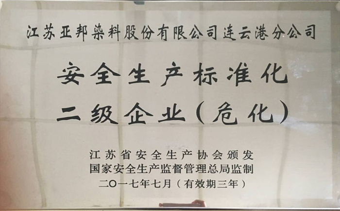 染料连云港分公司 取得国家安全标准化二级企业换证证书