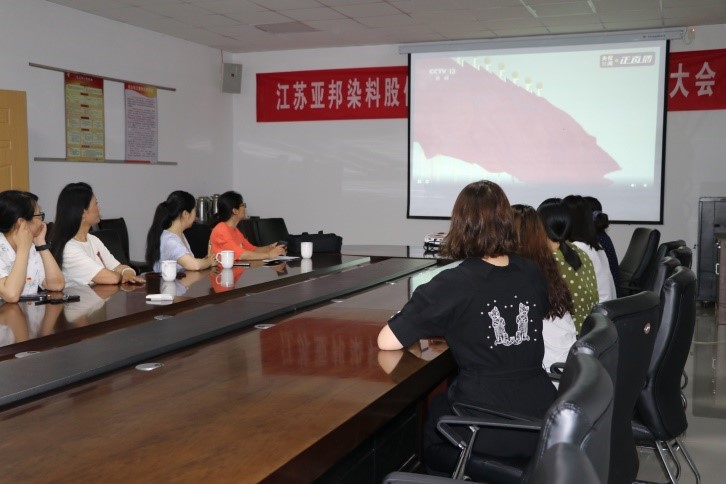 党员们集聚一堂在大会议观看直播,大家为祖国的繁荣富强打call!