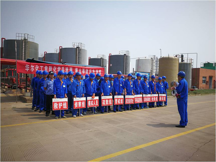 6月25日下午15时,随着演练总指挥黄总一声令下,华尔化工DMF泄漏、着火应急演练拉开了帷幕。“王班长、王班长,A9罐区5—1#DMF储罐底阀阀口垫子泄漏”仓库原料罐区巡视员张晓明呼叫着。班长王玉源在立即向仓库马主任报告后,带领员工穿戴防护用品进入现场关闭储罐底阀,用干黄沙覆盖泄漏物后等待机修工消漏。马主任接到警情分别向生产一部范荣、安全部李永华汇报。机修工穿戴防毒口罩、防护手套及雨鞋赶到现场对泄漏法兰进行紧固后泄漏停止。王玉源和张晓明在使用铁锹对泄漏物进行收集过程中,不慎发生着火。安全部李永华和崔海港立即使用两具推车式干粉灭火器进行灭火,由于火情较大灭火失败,紧急撤离现场立即向各级领导汇报。接到报告后,公司立即启动火灾应急处置预案并成立了以总经理助理黄书兵为总指挥的现场指挥部,各项应急救援工作有序展开。为防止事故进一步扩大,避免人员伤亡,现场应急处置人员立即按预案组织罐区人员紧急疏散。罐区周边三车间、九车间紧急关闭水电气,停止滴加、蒸馏及升温等化学工艺反应,商品仓库、品管二部停止岗位工作,在疏散组长王建伟带领下紧急撤离生产区域至上风向紧急集合点(演练时主风向为东北风,疏散集合地点为东门卫外)。东门卫禁止外来车辆及人员进入。警戒组人员接到指令后立即赶至现场,用警戒带将泄漏区域的南面、北面、东面分别进行警戒,禁止非相关人员及车辆进入现场。保障组人员驾驶机动车辆并携带应急药品、担架在原地待命。抢险组到达现场后,立即组织实施处置措施。抢险人员分成3队分别使用A9罐区东侧、北侧消防水对着火点喷雾状水灭火,A8罐区东侧消防水对5—1#DMF储罐进行降温。十多分钟后,大火被扑灭,检测组对现场废水进行取样检测,检测合格污水进入环保应急池,^后抢险组对5—1#DMF储罐周边区域黄沙收集入桶送至固废堆场。