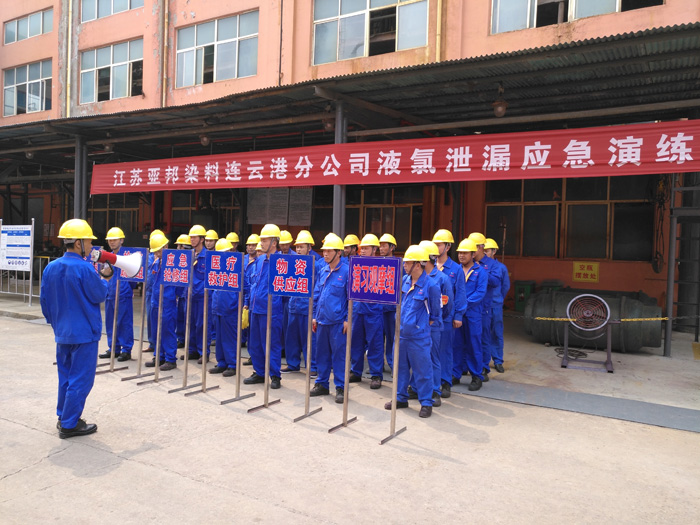 在生产现场的车间主任江建华立即启动车间应急救援预案,并报公司的安全部、生产部、环保部。按照应急预案,安全警戒组负责人在东西出口安排人员拉起警戒线,禁止人员出入;物资供应组负责人安排人员及时送上抢救物资(空气呼吸器、防化物、药品等)。抢险组由一人开启水雾喷淋阀门形成水幕墙,抑制氯气扩散;抢险组二人佩戴防毒面具将排气扇放在泄漏钢瓶的上风处,进行强制通风加速氯气扩散;另两人则进入现场断开钢瓶与系统连接并用专用堵漏器进行堵漏。^后确认堵漏成功,险情解除。在现场观摩的安全部部长唐善国对演练效果进行了评价,指出不足。
